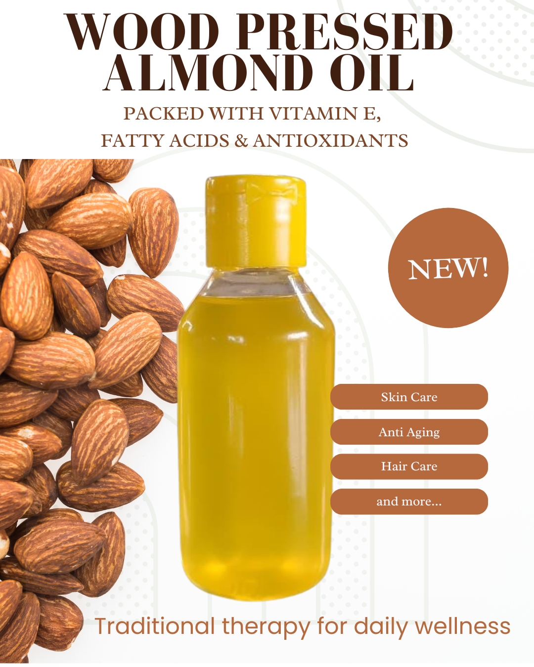 A premium, wood-pressed almond oil extracted naturally to preserve nutrients, rich flavour, and wholesome goodness — ideal for cooking and wellness.